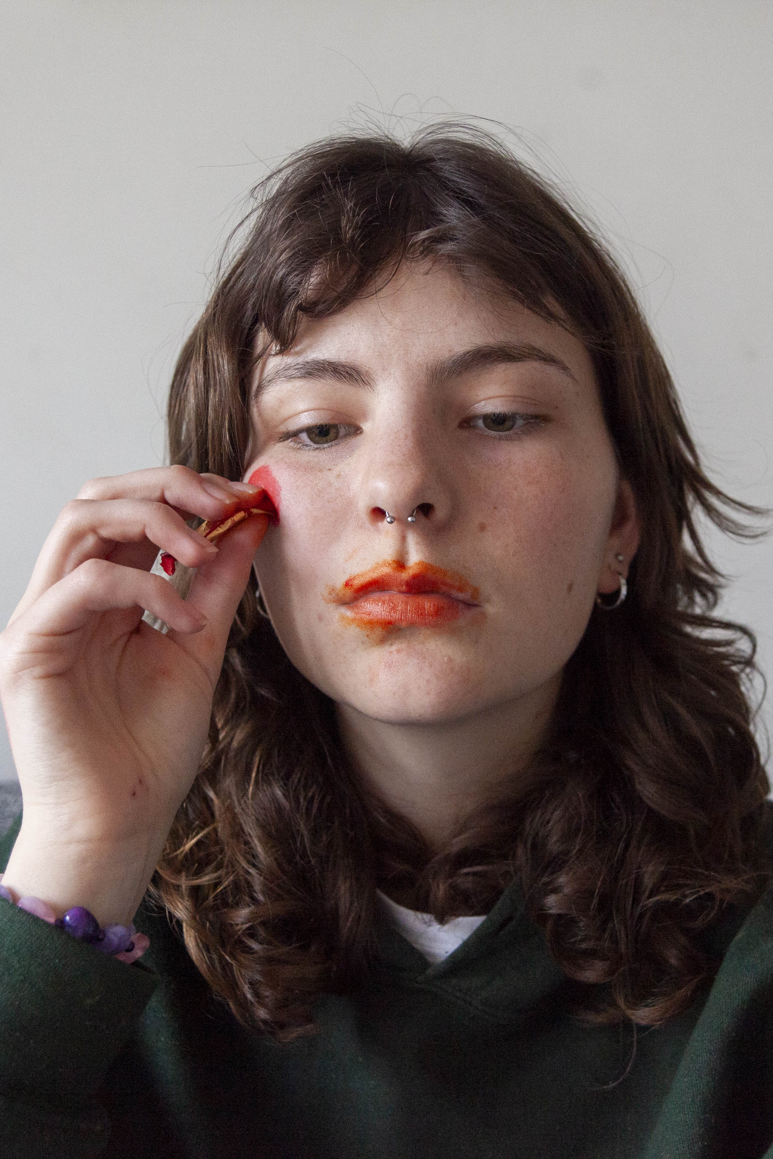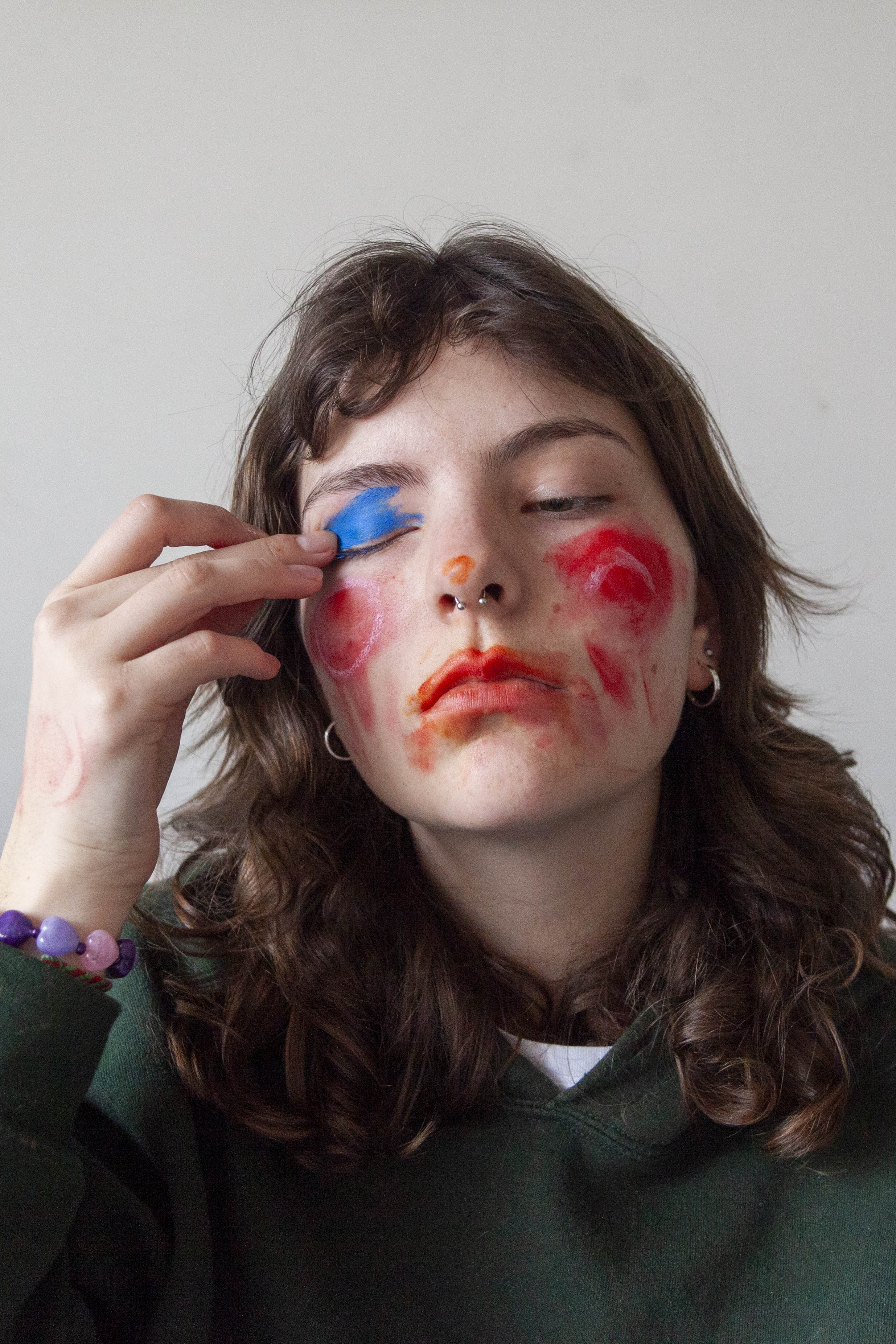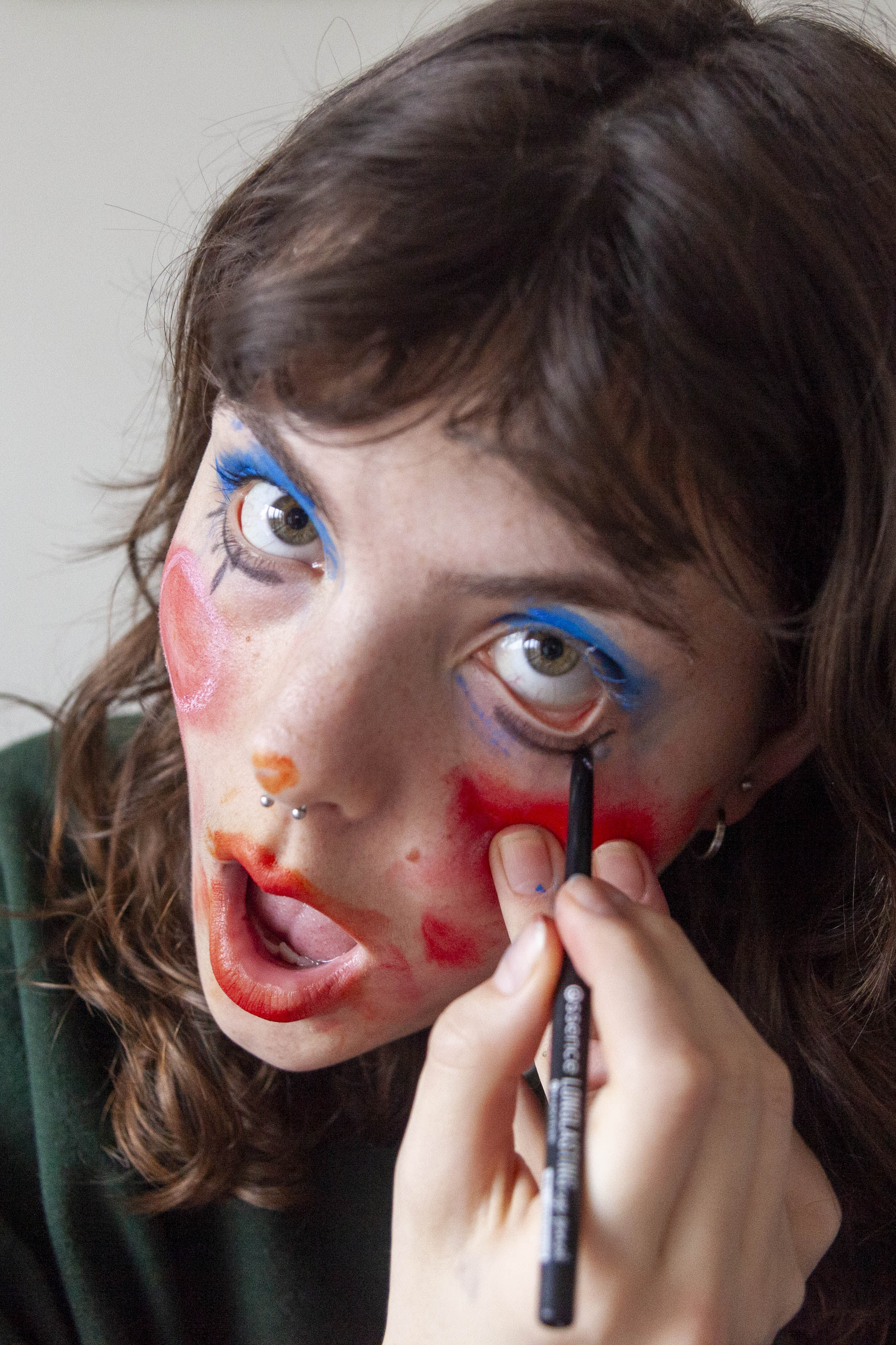 „Ze is zeker ongesteld, Trut, Mannenwerk” en nog veel meer termen, het zijn allemaal uitdrukkingen die je dagelijks hoort. Ik ben uitgegaan van mijn fotoserie waarin ik mezelf heb geportretteerd. In de serie wilde ik laten zien dat vreemd gedrag van vrouwen niet wordt gerespecteerd. Vrouwen mogen geen fouten maken. Met hulp van een Stanleymes, een schaar en de bovenstaande termen, heb ik mezelf de taak gesteld om deze begrippen zo te isoleren dat ze absurd overkomen. Digitaal heb ik nog typografie toegevoegd.