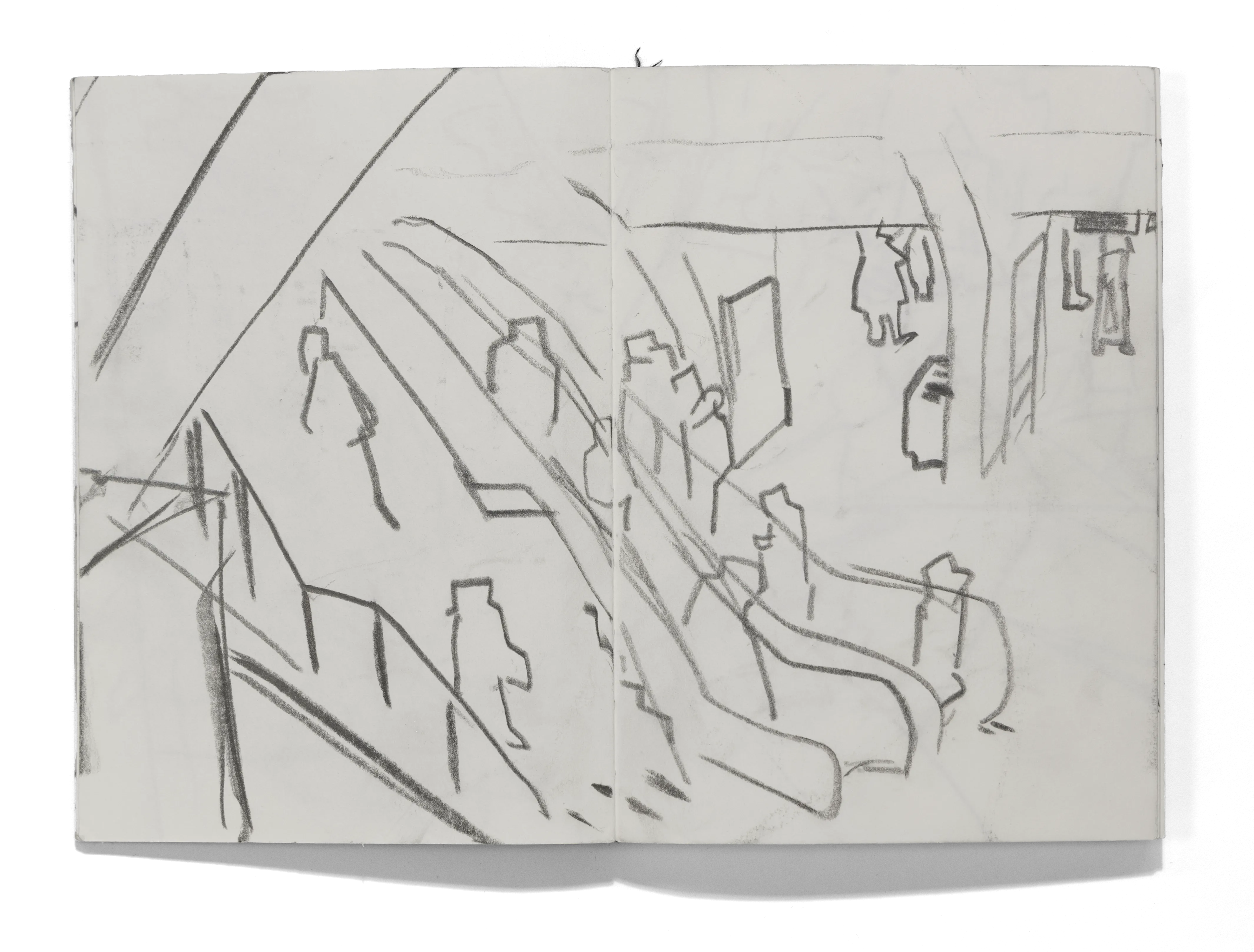 Of het nu op het station of in een museum is – een schets is snel gemaakt. Sinds drie jaar neem ik mijn schetsboek overal mee naar toe. Tijdens een tekenles bij Christof Fischer heb ik geleerd om abstracte, hoekige en snelle schetsen te maken. In tegenstelling tot fotografie draait het bij een schets niet om precisie, maar om de vormen die mijn interesse wekken. Het liefst teken ik scènes in de openbare ruimte met mensen, stillevens of portretten.